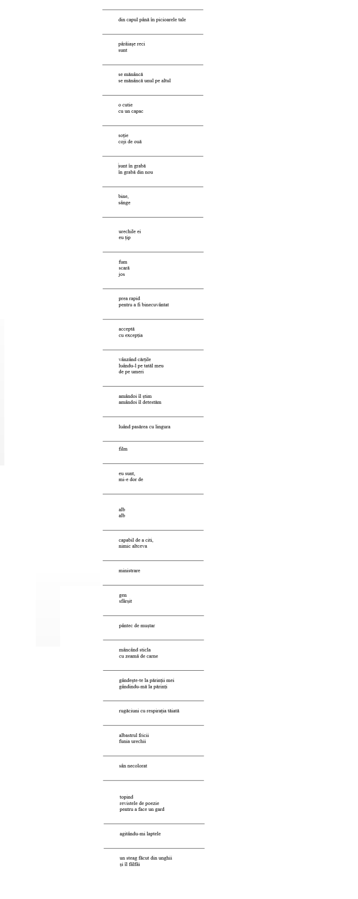 Greutatea mea devine ceva ce nici nu mă apasă nici nu mă eliberează stomacul părul ochii totul așezat separat la vale ai putea spune cum spune Susan sclipirea e prea puternică o notă de final nu e ca și cum n-ar străluci becul sau cubul ăsta anume însă acea figurație aproape că prea copleșește, ceea ce cere un moment mai de liniște. Hazarurile se vâră în mod constant, căldura defazată, aerul însuși tangibil, îl simțim cum atârnă, face cu putință un anume soi de calitate separată, percepția cred că este cuvântul care să-l descrie, aruncând o privire asupra lumii & privind-o cum se prăbușește în urmă, aici întâmplarea aceluiași gen de mișcare repetându-se la intervale mai mult sau mai puțin inegale. Eu vreau pentru o secundă să explic, nu că ar trebui să fim ascunși unul de celălalt pentru „Etern”, fie și a spune un cuvânt ca acela automat pare… Mă întreb doar ce e, asta e, sus, repede, poate lua oricând orice turnură particulară, oricare mod în care poți face viața un pic mai scurtă un pic mai erectă, înțeleg chestia asta elementară nu e mare șiretenie serios că el poate cu siguranță să manipuleze construcțiile alea, că până când degetele sale de la picioare e ce-i cum trece nu pot atât să uit cât să refuz a încerca să pun degetul pe el. Nu-i de ajuns un subiect sau speranța vreunui viitor subiect, o vreme nu-mi aminteam să destind acel ceva aici – manechin, model – umple în & ajunge la un decent „embarcadero del notre pueblo”. Am ieșit din mașină & l-am căutat, m-am simțit așa de dezorientat – oare am greșit strada țineam minte că e mai mare parcă – sau este ăla unul și același magazin de dulciuri ce face grăsanul ăla stând afară toată ziua. M-am săturat de asta, să deschid ușa & să-mi aud vocea răsunând sub greutatea lui eu nu prea pot să-mi dau seama care este materialul doar de data asta am știut că este un material de bază, un pufăit lung & ridică-l & ține-l la distanță &–